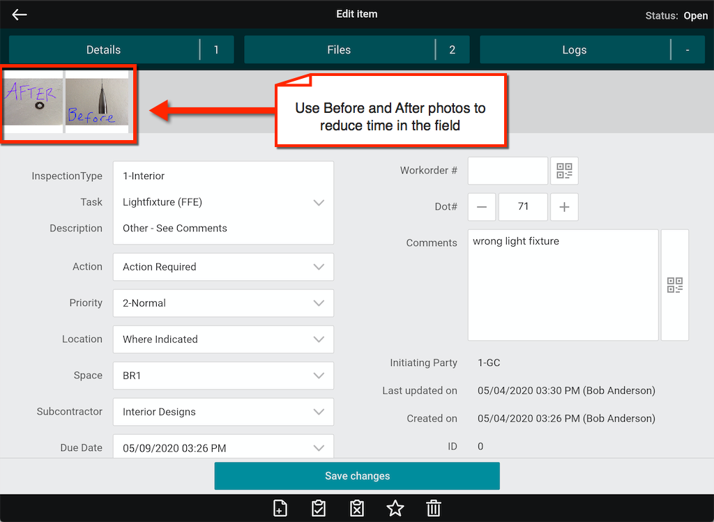 Save valuable time by using calculated methods for inspections and how subcontractors communicate that their work is complete. Some apps like FinishLine enable subcontractors to view their items and then “complete” their work by changing the item status.