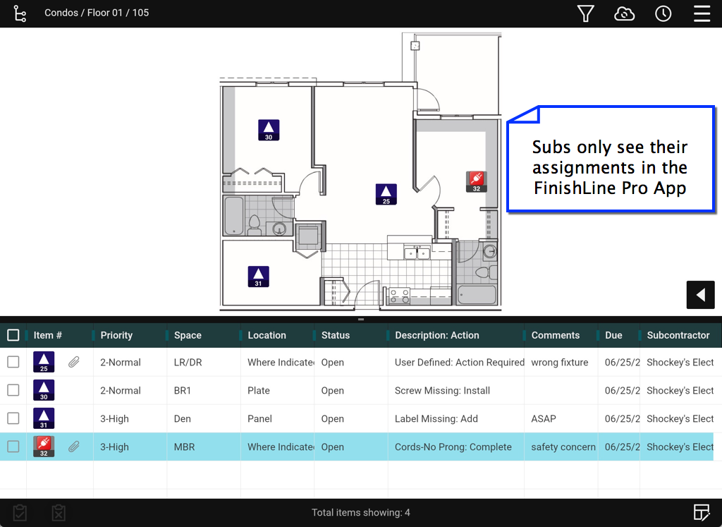 2) Subs only see their assignmentsSome punch list apps show subs every outstanding item for a project. Not FinishLine. Powerful user permissions keep it simple, by only allowing subs to view and access the punch list items that they are responsible for (see image below).